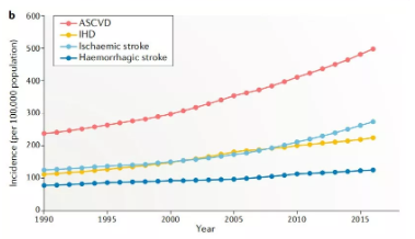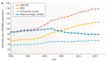 腦卒中、冠心病等心血管疾?。–ardiovascular disease,CVD)是造成我國居民死亡和疾病負擔的首要病因,占中國死亡人口的40%,CVD發(fā)病率呈現(xiàn)逐年快速攀升的趨勢,目前我國CVD患者超過 2.9 億例。動脈硬化性心血管疾?。ˋtherosclerotic cardiovascular disease,ASCVD)是一種單一類型的心血管疾病,包括缺血性卒中(Ischaemic stroke)和缺血性心臟?。↖schaemic heart disease,IHD)。從1990年至2016年,ASCVD的死亡人口增加近100萬,據統(tǒng)計2016年約有240萬人死于ASCVD,占CVD總死亡人口的61%,占所有死亡的25%。