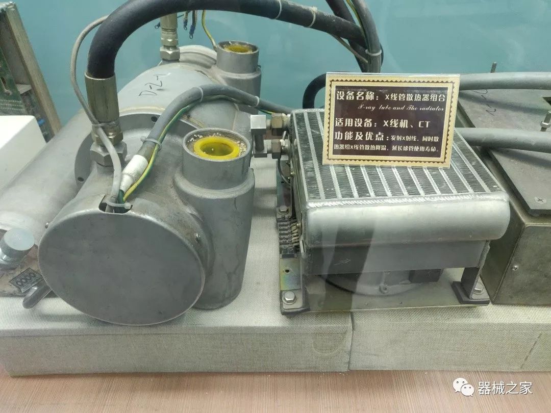由于X線機產生X射線的過程中只有百分之一的動能轉化為X射線,其余的能量都以熱能的形式散失。這就需要良好的散熱設備,也就是這個散熱器。散熱器大多采用油冷。變壓器油不僅絕緣,而且能夠吸收散亂射線,防止擊穿。使用時,一般會用油泵將冷油泵入到球管周圍,將熱油從另一管導出,在冷卻板上冷卻,循環(huán)利用。
