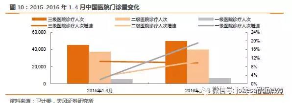 2016年1-4月一級醫(yī)院數量激增,同比2015年增長24%,而2015年同比增長9%。醫(yī)院數量不代表病人流向,但是作為標桿數據,可一定程度上表明政府的資金投入流向。而門診量則是分級診療成效的重要參考數據。