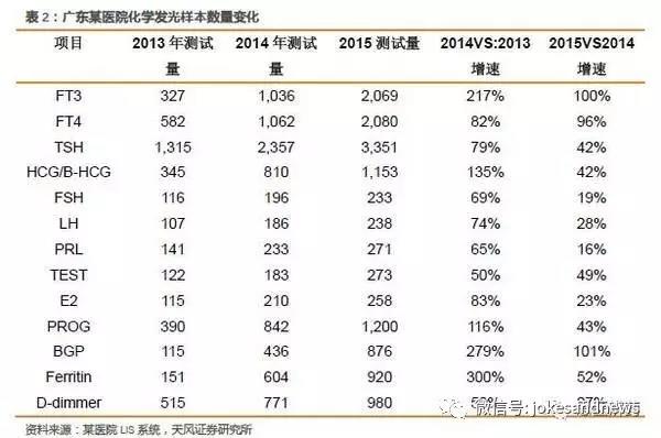 廣東省某基層醫(yī)院,一級甲等,2014年檢驗科收入約為1000萬。2013年開始使用國產全自動發(fā)光儀,開展項目主要為甲功、激素兩個套餐。2015-2013年樣本增量變化如下。
