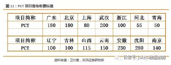 按照購買力平價,PCT項目在中國收費為50比較合理。最早進口品牌進入中國,一般先進入經濟相對發(fā)達,人口密集的大省,因此最早的價格多在150-200之間。2014年上海的PCT價格為100,今年已經降為80,未來依然存在降價的趨勢,并且會各個城市都會持續(xù)下調收費。