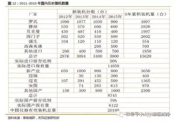 根據以上邏輯,我們大致可以測算目前的存量市場,發(fā)光還未完全滿足終端需求,2015年儀器保有量來看,只滿足了60%的需求。而未來需求端的增長依然保持極高的增速,除了進口企業(yè),少量國產優(yōu)秀品牌可以分享藍海市場,儀器裝機依然有很大的空間待開發(fā)。