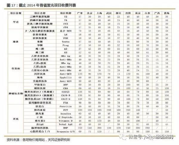 中國各個省的收費標準差異較大,北京是以進口和國產來區(qū)分,有些地方是按照醫(yī)院級別來區(qū)分價格,江浙幾乎不區(qū)分方法學,大部分區(qū)域是分方法學收費,如下圖所示。最大收費標準差異有接近10倍差異,但整體趨勢是類似的。即腫瘤相對價格高,傳染病價格相對較低,甲功和激素位于中位,另外一些不太普及的項目,比如骨代謝、維生素等等,價格起伏較大。