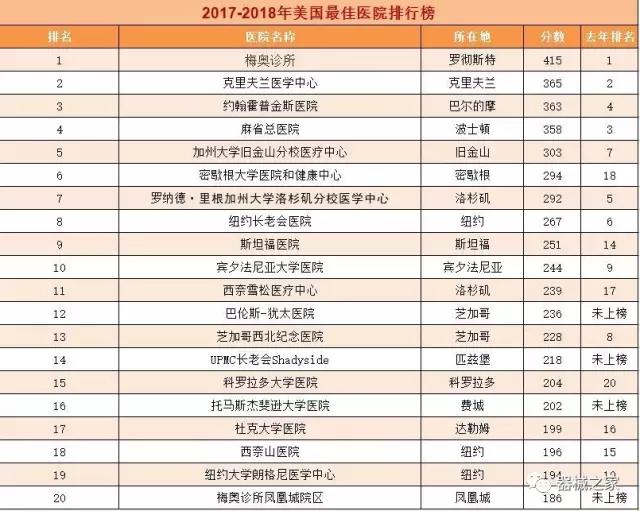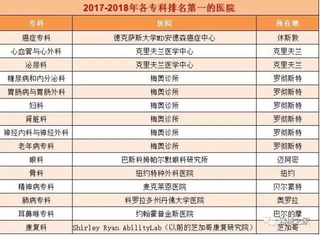 在醫(yī)療界梅奧診所就是傳說中的麥加,世界頂尖的醫(yī)療機構。2017年8月8日,《美國新聞與世界報道》公布了2017-2018美國最佳醫(yī)院排行榜,梅奧診所以415分的總分再次榮登榜首,并在糖尿病和內分泌???、胃腸科、婦科、腎臟科、神經專科和老年病學六個??浦信琶谝弧?/span>