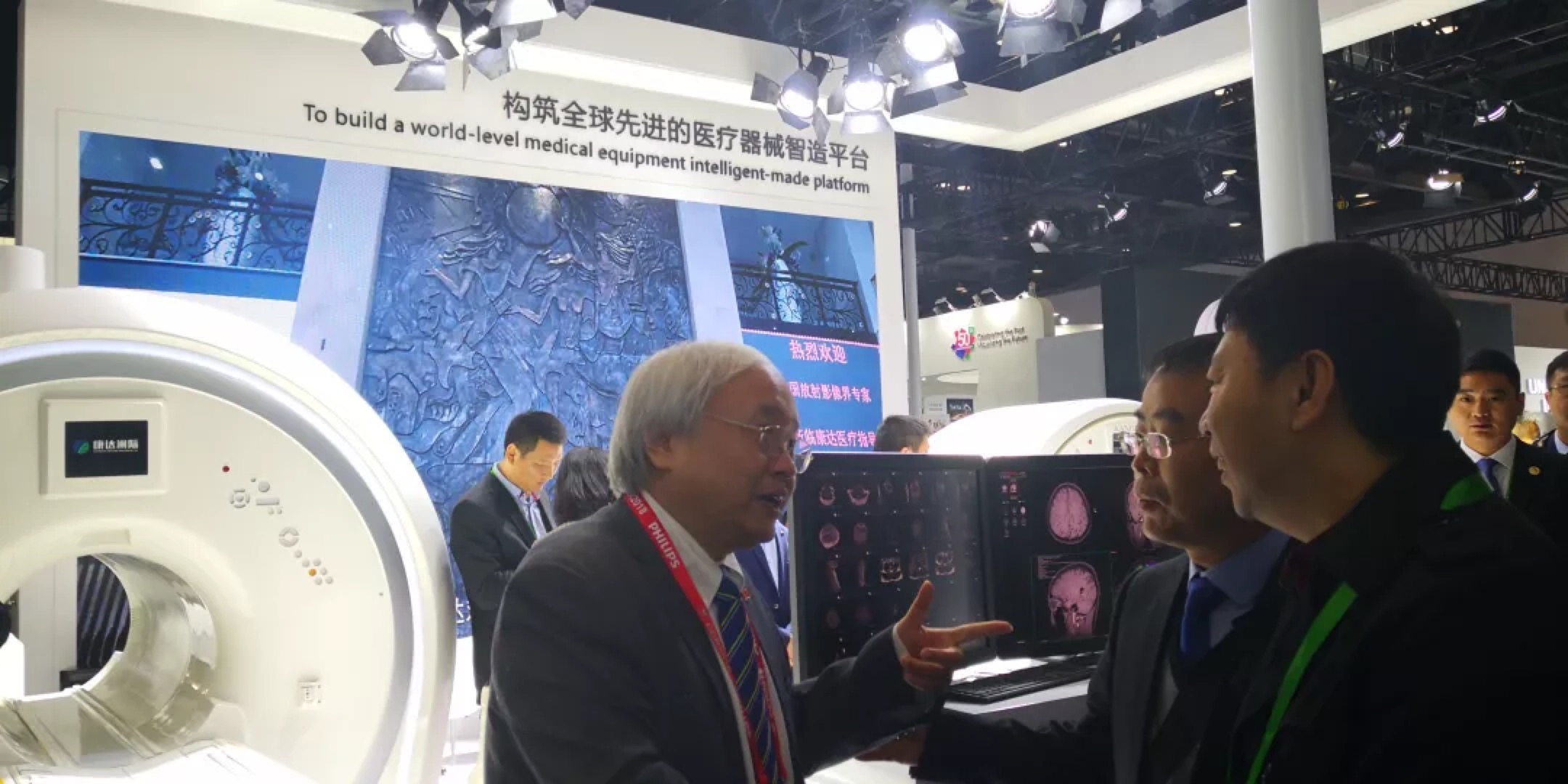 中國放射學(xué)家、中華醫(yī)學(xué)會(huì)放射學(xué)分會(huì)主任委員、北京協(xié)和醫(yī)院放射科主任金征宇一行也特意來到了康達(dá)洲際展臺(tái)。金征宇教授在聽取了康達(dá)的工作人員對康達(dá)洲際1.5T磁共振等一系列產(chǎn)品的介紹后,對康達(dá)洲際在產(chǎn)品的研發(fā)和創(chuàng)新上給予了高度肯定。