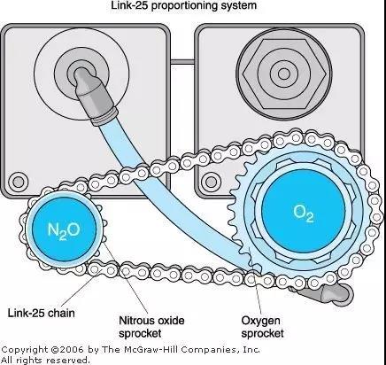 為了防止麻醉機輸出低氧性的氣體,麻醉機還有流量計聯(lián)動裝置和氧比例監(jiān)控裝置,使新鮮氣體出口輸出的最低氧濃度保持在25%左右。采用的是齒輪聯(lián)動的原理。在N?O流量計鈕上,倆齒輪之間用鏈條連接,O?旋轉(zhuǎn)一圈,N?O旋轉(zhuǎn)兩圈。當(dāng)單獨旋開O?流量計針型閥時,N?O流量計保持不動;當(dāng)旋開N?O流量計時,O?流量計隨之聯(lián)動;兩個流量計均打開時,逐漸關(guān)閉O?流量計,N?O流量計也隨之聯(lián)動下降。