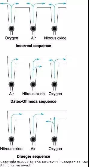 另外,不知道大家有沒有觀察過流量計的順序問題,其實這也有講究。也就是把氧流量計安裝在最靠近共同出口處,萬一在氧上風(fēng)位發(fā)生的漏口,這樣流失的大部分是N?O或者空氣,O?損失最少。當(dāng)然,它的順序也不能保證不發(fā)生因流量計破裂所致的低氧。
