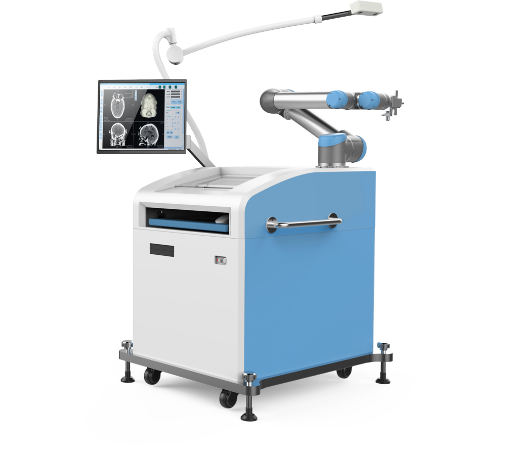 “睿米”神經(jīng)外科手術(shù)機(jī)器人由腦、眼、手三部分組成。計算機(jī)及軟件系統(tǒng)是大腦,負(fù)責(zé)合成患者頭顱的三維模型,以便醫(yī)生觀察病灶,進(jìn)行手術(shù)規(guī)劃;機(jī)械臂是手,定位已規(guī)劃的手術(shù)位置(精度可達(dá)1毫米),同時也是多功能手術(shù)平臺;攝像頭則像人的雙眼,可實時捕捉機(jī)械臂和患者的位置信息,確保機(jī)械臂按手術(shù)規(guī)劃路徑運動到指定位置。