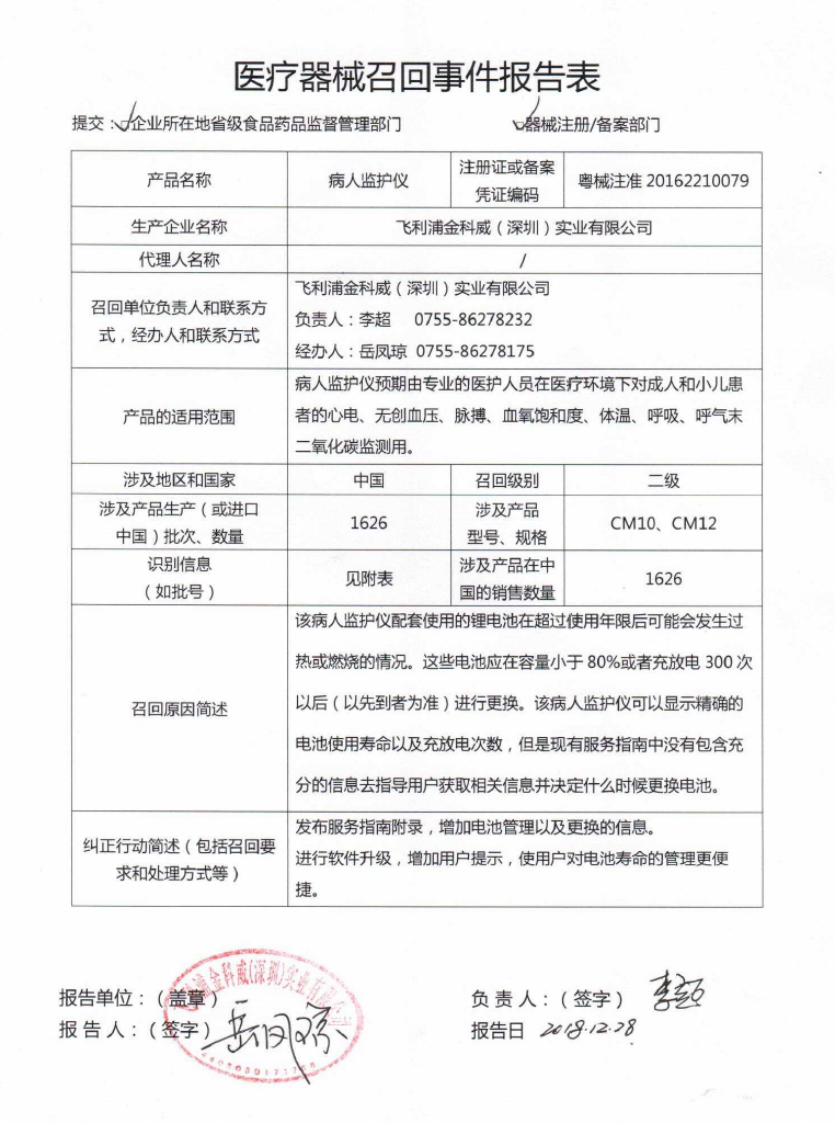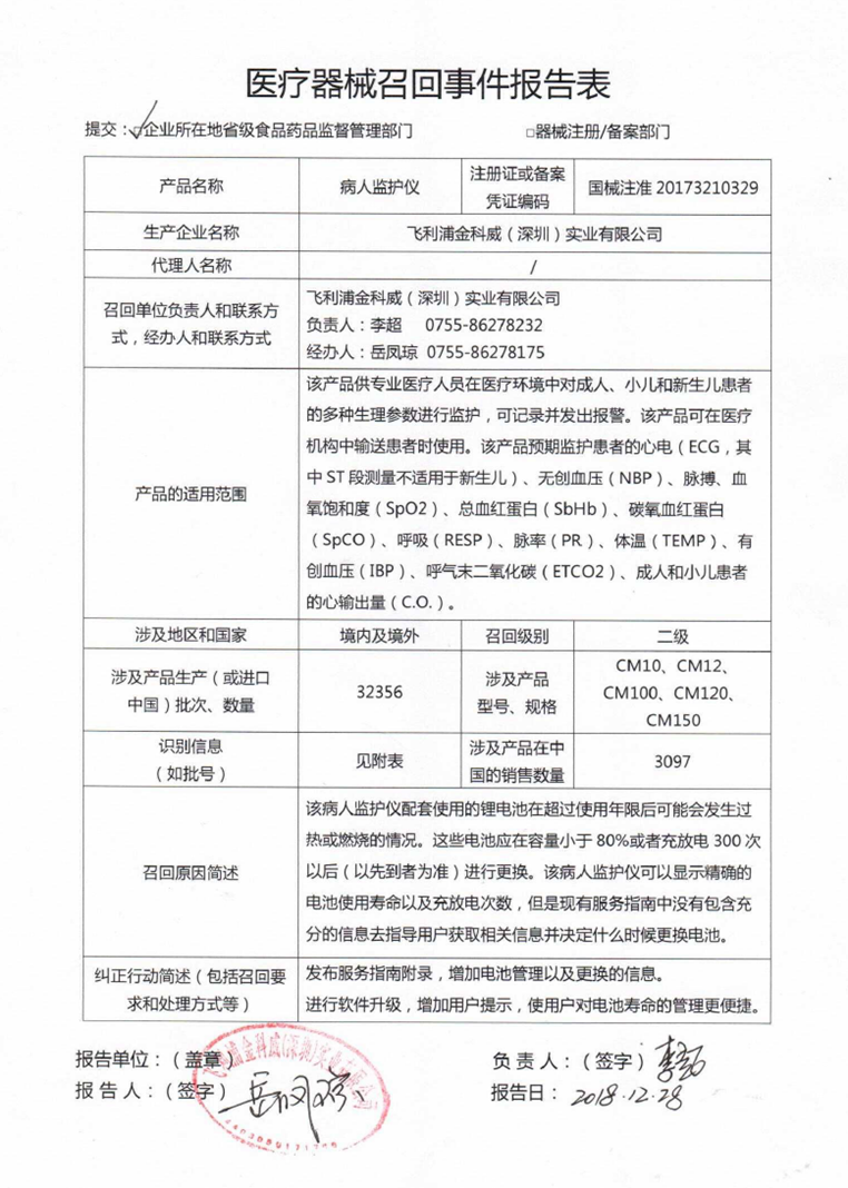2018年,飛利浦也曾發(fā)布了多起對(duì)病人監(jiān)護(hù)儀的召回,其中一份召回報(bào)告也是二級(jí)召回,涉及到2672臺(tái)監(jiān)護(hù)儀,同樣是通過(guò)監(jiān)控內(nèi)部產(chǎn)品投訴發(fā)現(xiàn),存在鋰離子電池超過(guò)預(yù)期使用壽命后發(fā)熱或燃燒風(fēng)險(xiǎn)。