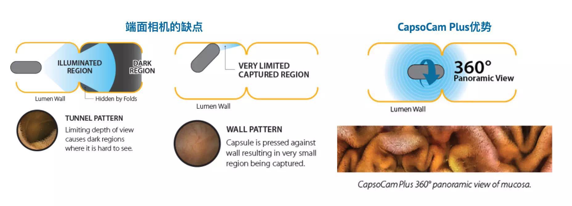 CapsoCam Plus旨在通過提供小腸粘膜的360o全景側視圖來提高診斷信心。更精細的成像和更大的垂直視野允許比前幾代CapsoCam更好的組織表征。
