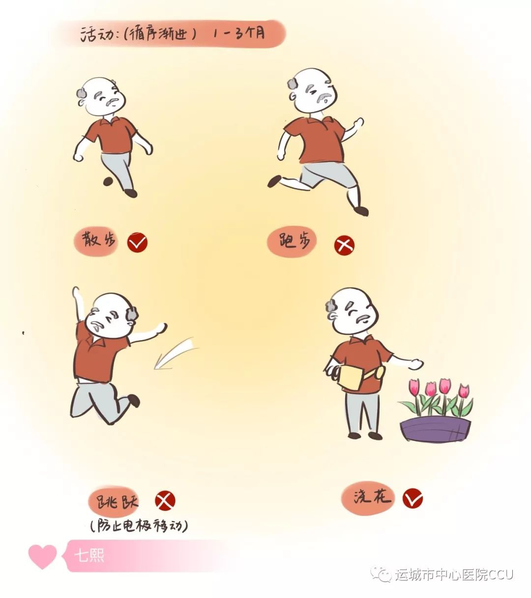 出院后1--3個(gè)月,活動應(yīng)循序漸進(jìn),防止電極移位。
