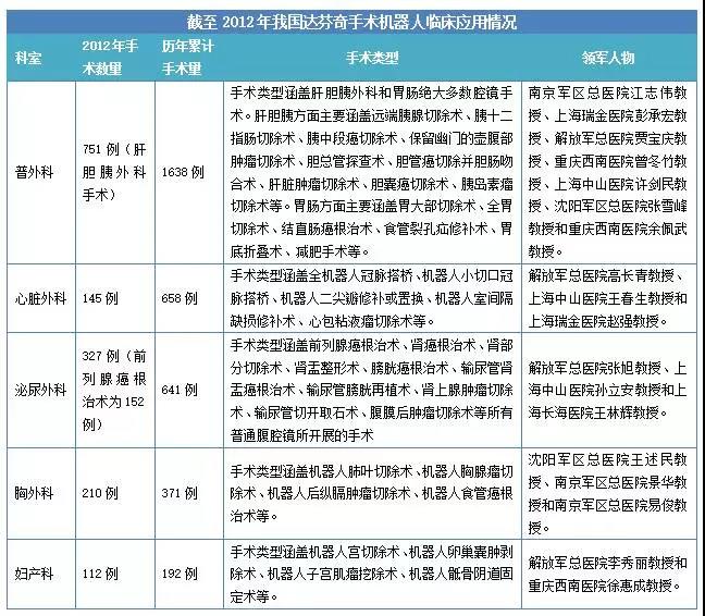我國2013年及以前配置了18臺手術機器人,2015年,我國的手術機器人數(shù)量大約為57臺。截至2012年,我國手術機器人臨床應用最多的三個科室為普外科、心臟外科和泌尿外科。
