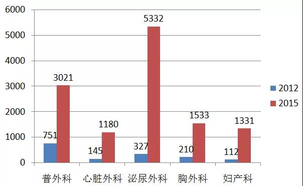 截至2015年12月,全國當年完成手術機器人手術11445例,歷年總計完成手術22917例,臨床應用最多的三個領域為泌尿外科、普外科和胸外科。