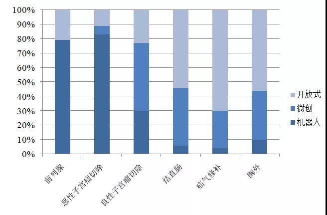 從手術類型看,達芬奇手術機器人臨床應用可分為傳統(tǒng)操作復雜的手術和較為簡單的良性腫瘤切除手術兩類。根據(jù)直覺外科公司年報,2015年美國手術機器人的總手術量為49.9萬例,其中泌尿外科占20%,婦科占48%,普外占28%。具體科室和代表手術情況如下。