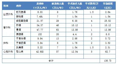 我們根據(jù)手術機器人的適應癥對每年市場規(guī)模進行了測算,認為手術機器人國內潛在市場空間為136.73億元/年。其中,泌尿外科和婦科市場規(guī)模為15.73億元,普外科為58.3億元,心臟外科為62.7億元。