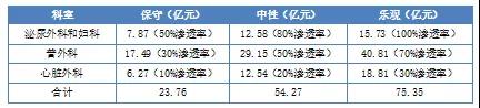 根據(jù)以上測算數(shù)據(jù)以及合理預計,對國內每年的手術機器人市場規(guī)模進行估算。因此,從保守、中性和樂觀三種測算來看,現(xiàn)階段我國每年手術機器人服務市場的規(guī)模為23.76億元、54.27億元和75.35億元。但隨著手術機器人成本降低以及技術水平提高,其在普外和心臟外科的滲透率也會提高,市場規(guī)模將進一步擴大。