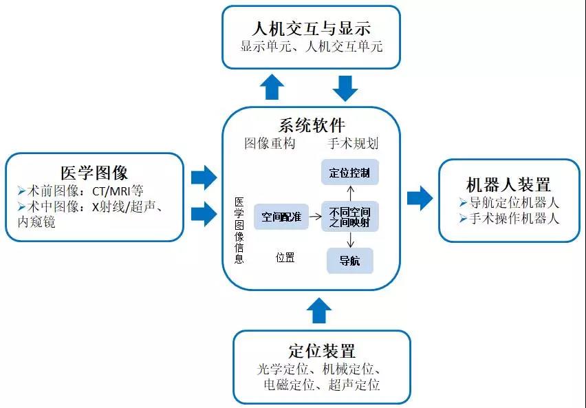 手術機器人主要的功能模塊包括人機交互與顯示、醫(yī)學圖像、系統(tǒng)軟件、機器人裝置、定位裝置。系統(tǒng)軟件中的圖像重構、空間配準和定位控制等,是手術機器人最為核心的部分;而硬件輔助裝置如醫(yī)學圖像、機器人裝置和定位裝置需要與臨床手術具體情況相結合;人機交互與顯示必須充分考慮醫(yī)生的需求和臨床應用場景。